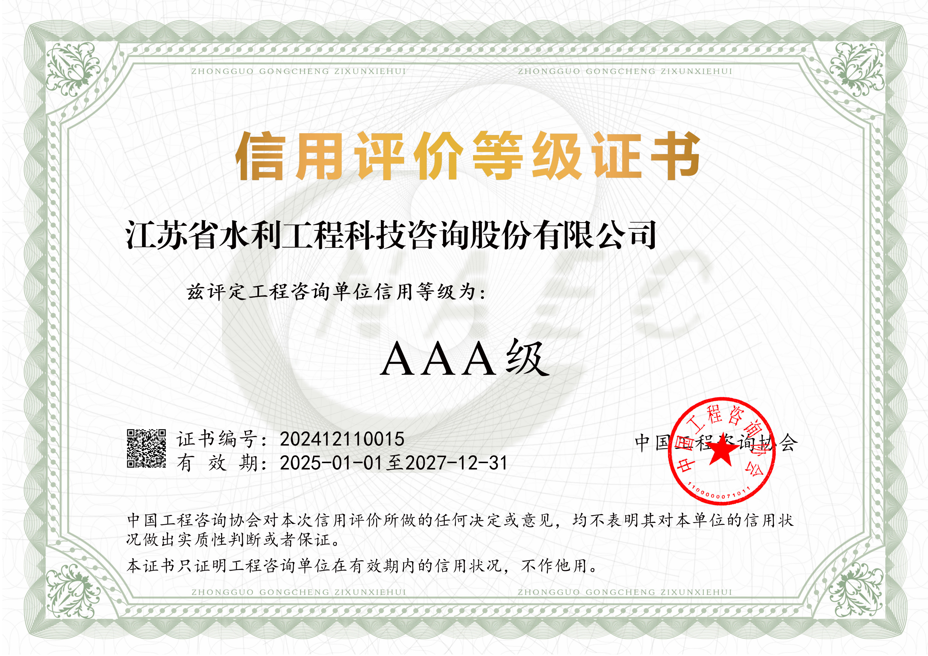 | 喜訊 我司榮獲首批“AAA”級信用工程咨詢單位作者:admin 來源: 日期:2025-1-21 17:14:31 人氣: