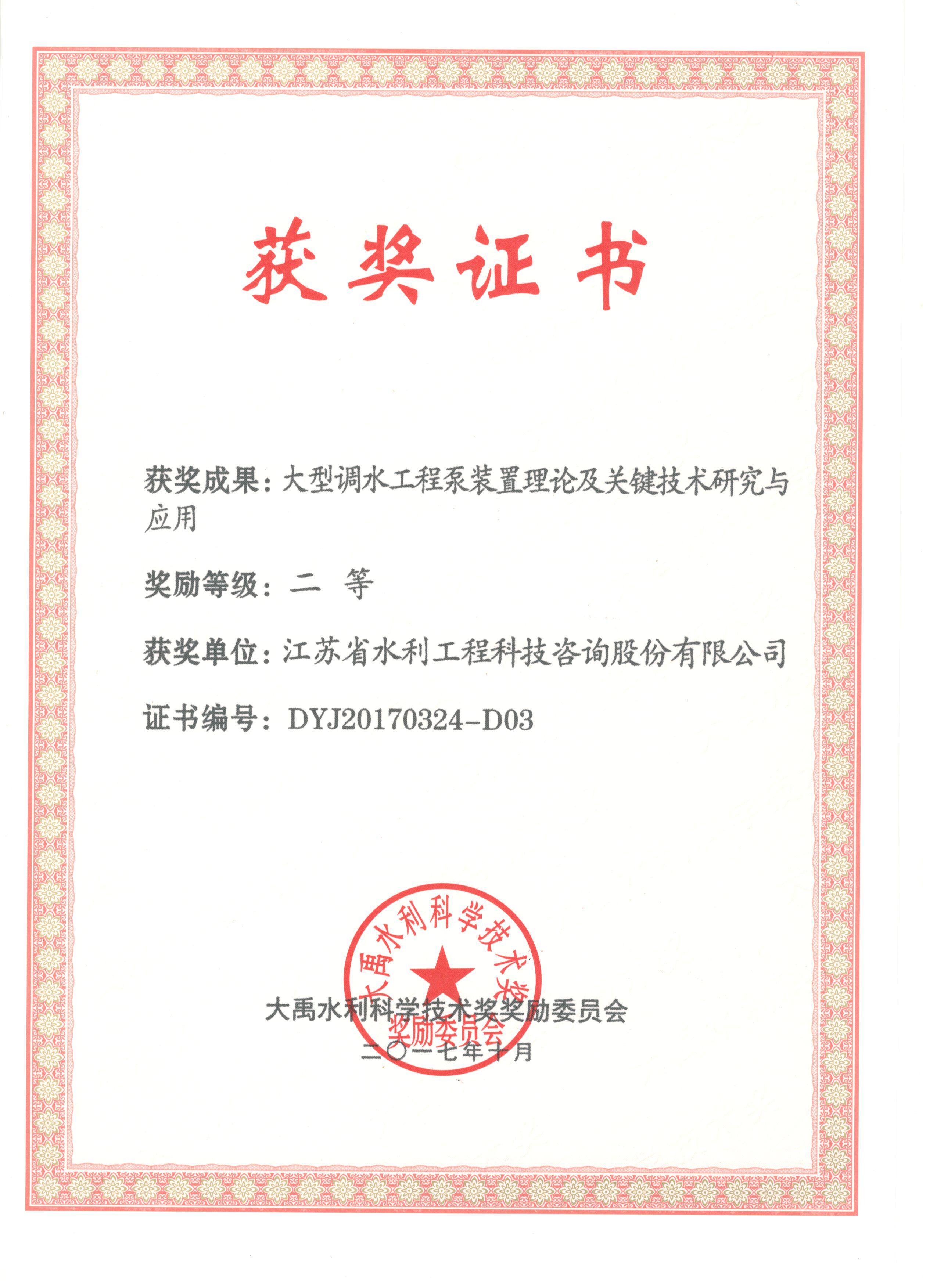 近期,由我公司參與完成《大型調(diào)水工程泵裝置理論及關(guān)鍵技術(shù)研究與應(yīng)用》喜獲2017年度大禹水利科學(xué)技術(shù)二等獎(jiǎng)。