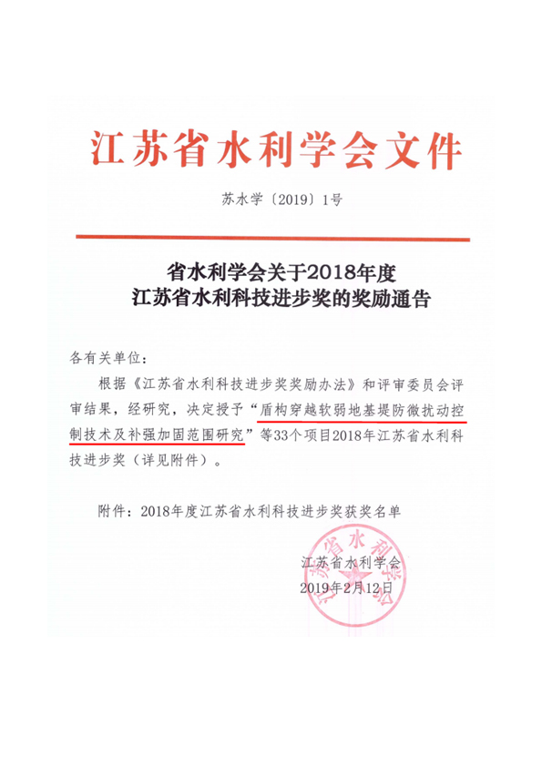 近期,我公司主持完成的《盾構(gòu)穿越軟弱地基堤防微擾動(dòng)控制技術(shù)及補(bǔ)強(qiáng)加固范圍研究》喜獲2018年度江蘇省水利科技進(jìn)步一等獎(jiǎng)。