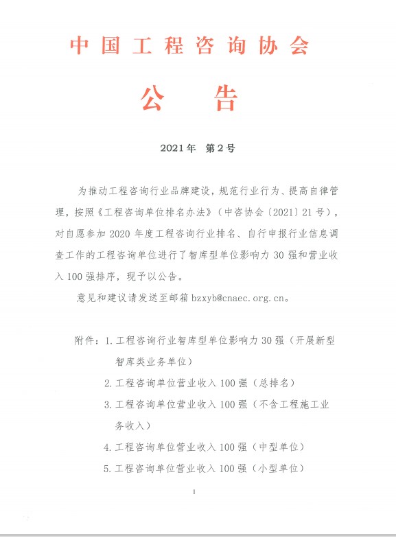 10月26日,我公司榮獲“工程咨詢單位營業(yè)收入100強(小型單位)”稱號。由中國工程咨詢協(xié)會發(fā)起的工程咨詢行業(yè)智庫單位影響力30強、工程咨詢單位營業(yè)收入100強榜單發(fā)布,肯定了我公司在體制機構(gòu)改革、工程咨詢服務(wù)數(shù)字化、全過程咨詢、疫情防控、脫貧功堅等工作上的成績。
