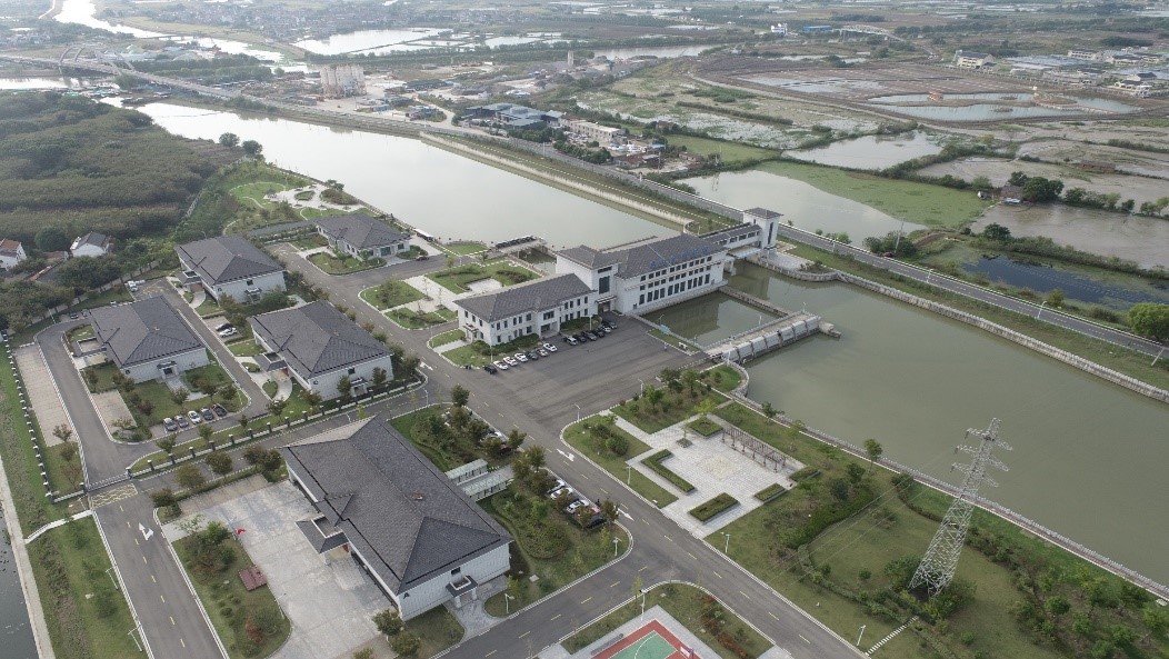 常州市金壇區(qū)龍山水利樞紐工程位于通勝地區(qū)通濟(jì)河下游南支出口老丹金溧槽河南端上,距離航道改道河口600米處,樞紐由泵站和節(jié)制閘組成。泵站設(shè)計(jì)排澇流量70m3/s,裝機(jī)5臺(tái)套豎井貫流泵,其中3臺(tái)單向泵、2臺(tái)雙向泵,單機(jī)流量14m3/s,配10kV異步電動(dòng)機(jī),單向、雙向水泵單機(jī)功率分別為400kW、500kW,總裝機(jī)容量2200kW。節(jié)制閘凈寬24m,共2孔,每孔凈寬12m,閘室采用開(kāi)敞式鋼筋混凝土整體塢式結(jié)構(gòu)。