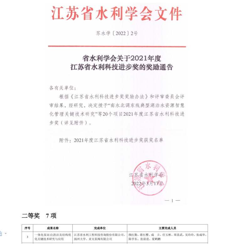 近日,根據(jù)蘇水學(xué)〔2022〕2號(hào)《省水利學(xué)會(huì)關(guān)于2021年度江蘇省水利科技進(jìn)步獎(jiǎng)的獎(jiǎng)勵(lì)通告》,由我公司主持完成的《一體化泵站自清潔及結(jié)構(gòu)優(yōu)化關(guān)鍵技術(shù)研究與應(yīng)用》項(xiàng)目喜獲2021年度江蘇省水利科技進(jìn)步二等獎(jiǎng)。 本項(xiàng)目通過(guò)數(shù)值模擬和模型試驗(yàn),研究泵間距、中心距、懸空高等安裝幾何參數(shù),以及導(dǎo)水錐、筒體結(jié)構(gòu)形式對(duì)自清潔效果的影響,并對(duì)筒體結(jié)構(gòu)性能進(jìn)行數(shù)值分析。提出筒底阿基米德螺旋柵及逆時(shí)針圓弧肋條,實(shí)現(xiàn)筒底的自清潔;研發(fā)四種一體化泵站自清潔關(guān)鍵措施及清淤裝置,解決泵站筒體內(nèi)底部雜質(zhì)難以清理等問(wèn)題。 本項(xiàng)目取得了豐碩的科研成果,發(fā)表學(xué)術(shù)論文3篇,授權(quán)實(shí)用新型專利4項(xiàng),相關(guān)研究成果已轉(zhuǎn)讓江蘇省明純給排水設(shè)備有限公司,并應(yīng)用于江蘇省亞太泵閥有限公司產(chǎn)品,推廣應(yīng)用價(jià)值及社會(huì)效益顯著。 (供稿:研發(fā)中心 夏鶴鵬)