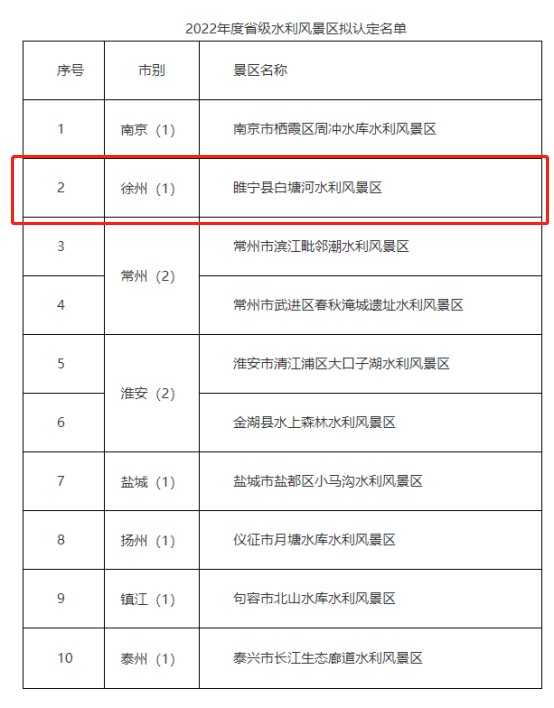 專家組通過查閱驗收資料、線上查看現(xiàn)場、聽取創(chuàng)建單位匯報、專家質詢、集體評議,經(jīng)綜合評價,認為該景區(qū)符合省級水利風景區(qū)認定要求。2023年1月6日,省水利廳對2022年度省級水利風景區(qū)擬認定名單進行公示,睢寧縣白塘河水利風景區(qū)擬認定為省級水利風景區(qū)。