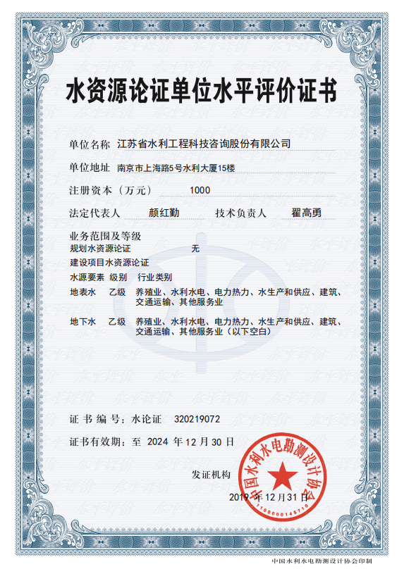 經(jīng)中國水利水電勘測(cè)設(shè)計(jì)協(xié)會(huì)核準(zhǔn),我公司取得水資源論證單位水平評(píng)價(jià)乙級(jí)證書,證書編號(hào)為水論證320219072,水文、水資源調(diào)查評(píng)價(jià)單位水平評(píng)價(jià)乙級(jí)證書,證書編號(hào)為水文證32219244。