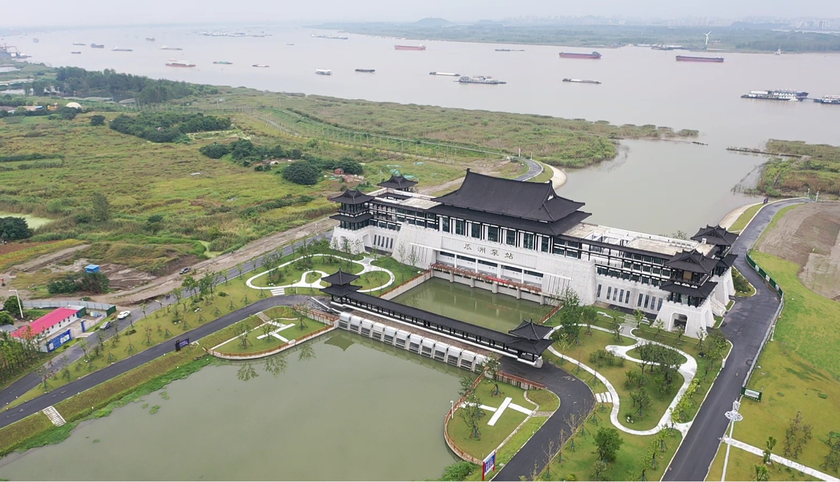揚州市瓜洲泵站工程站址位于古運河南端瓜洲閘東側,距長江堤防150m,泵站設計規(guī)模為170m3/s,設計凈揚程1.88m,最大凈揚程2.72m,選擇6臺立式全調節(jié)軸流泵(3000ZLQ-28.4),單機設計流量為28.4m3/s,水泵配套1600kW高壓同步電機,總裝機容量9600kW。采用肘型進水流道、虹吸式出水流道,真空破壞閥斷流。主機組采用液壓全調節(jié)的方式調節(jié)葉片角度,液壓裝置設置2套。批復總投資4.03億元。瓜洲泵站被譽為揚州“城市安全第一工程”,揚州濱江枕淮,是全國唯一地處兩大流域交匯點城市,一旦遭遇江潮頂托、淮水并漲,城市澇水外排不暢。瓜洲泵站建成后,提高了揚州市主城區(qū)水動力條件,有效實現主城區(qū)清水、活水,改善水質和水生態(tài)環(huán)境;提升了區(qū)域、流域防洪排澇能力,2020年汛期抽水量達3.23億m3,保障了揚州城區(qū)“不淹不澇”。 瓜洲泵站建筑設計新穎。理念:打造園林景觀水利樞紐;創(chuàng)新:建筑整體外觀采用唐式古典建筑,高層廠房將古城墻與重檐歇山頂完美融合,實現 “橋上觀樓,樓上觀江” 。體現了東方特有的審美情趣,美一是對稱美。美二是建筑群高低錯落有致,別有風味。將盛唐建筑出檐深遠、磅礴大氣特點與水工建筑物恢弘的氣勢相結合。立面設計上,用揚州傳統(tǒng)建筑色彩、白色和玻璃構筑一個簡潔大氣、有著獨特內涵的水利樞紐。與古運河、長江交相輝映,彰顯瓜洲古鎮(zhèn)、古渡文化特征。瓜洲泵站即將成為揚州市又一張亮麗名片和長江邊上一道靚麗風景線。