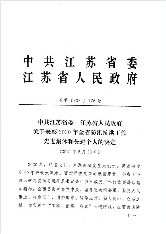 日前,中共江蘇省委 江蘇省人民政府發(fā)布《關(guān)于表彰2020年全省防汛抗洪工作先進(jìn)集體和先進(jìn)個人的決定》,授予我公司“全省防汛抗洪工作先進(jìn)集體”榮譽(yù)稱號,授予任玉彬副總經(jīng)理“全省防汛抗洪工作先進(jìn)個人”榮譽(yù)稱號。